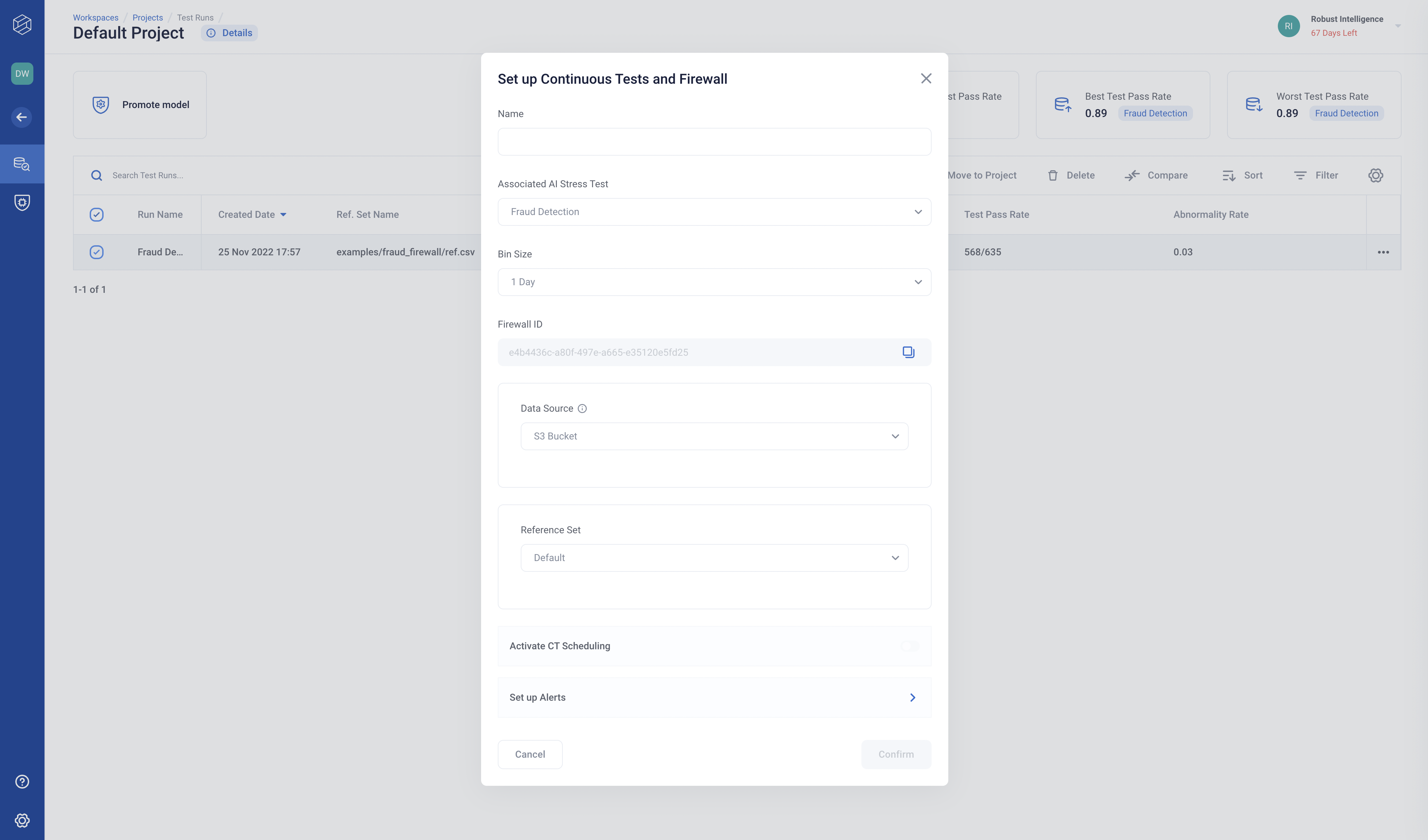 Click on “Configure AI Firewall” and fill out the details. The “Name”field can be a name of your choice. The “Associated AI Stress Test” field should correspond to the AI Stress Testing run that you just completed. The “Bin Size” field should be “1 Day”. Note that the Local Trial does not support configurable data sources — for ‘Data Source’, simple select ‘S3 Bucket’ and leave the defaults. Then copy the “Firewall ID” and click “Done”.